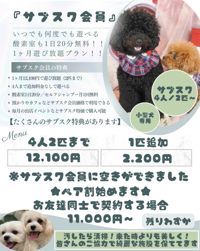 ・会員お一人で2頭を超えるワンちゃんをお連れの場合は、同伴者とご利用ください。